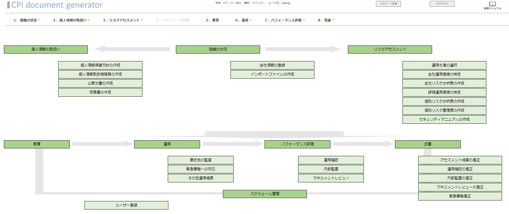 | 個人情報保護管理者 | 1.1.会社情報の登録 1.2.個人情報管理台帳作成 2.2.規程帳票作成 2.3.公表文書作成 2.4.同意書作成 3.1.~3.3.全社リスク分析 3.7.セキュリティマニュアル 5.2.緊急事態対応 8.改善(リスク対応) |